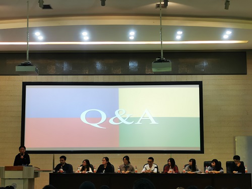 优秀学生代表发言结束后,见面会进入问答环节。九位优秀学生代表针对同学们关心的时间管理和考研院校推荐等问题做出了耐心细致的解答,并欢迎同学们进一步交流。