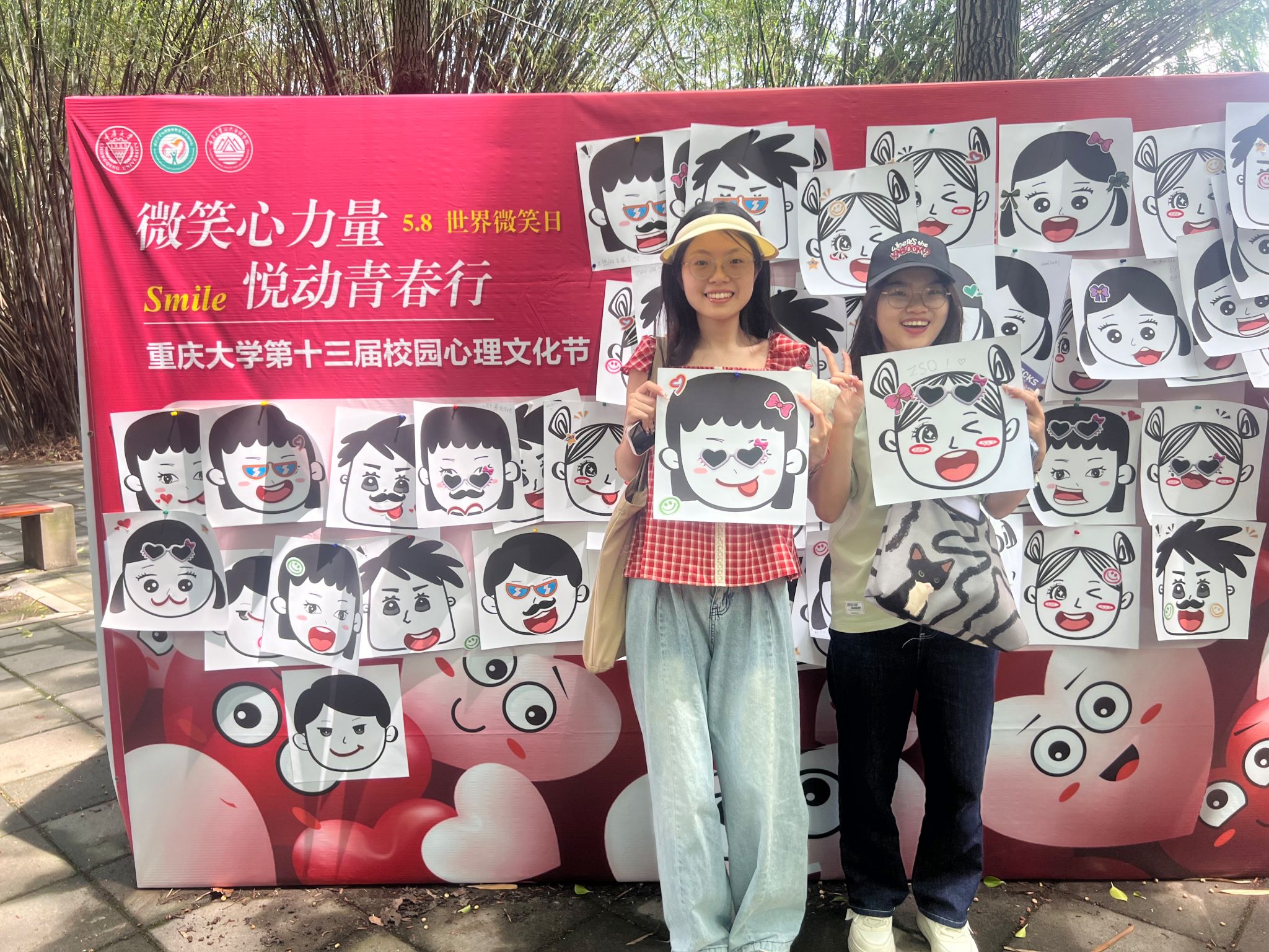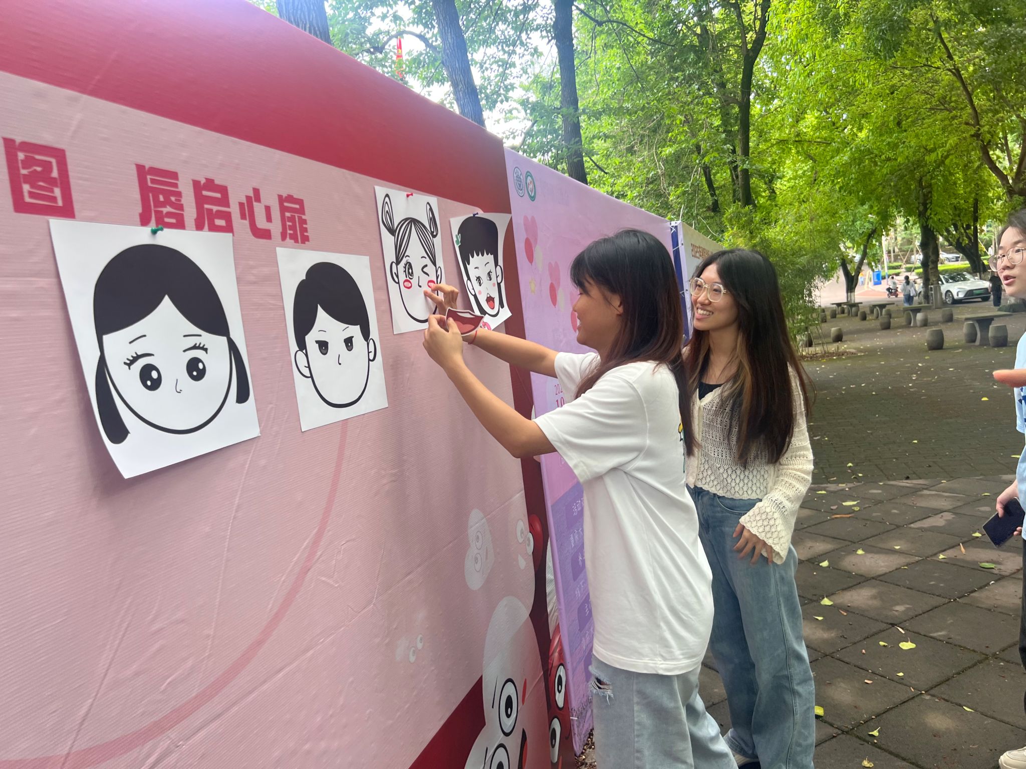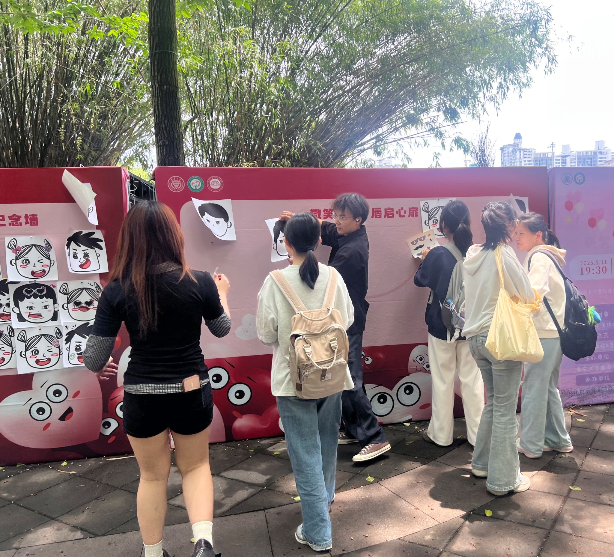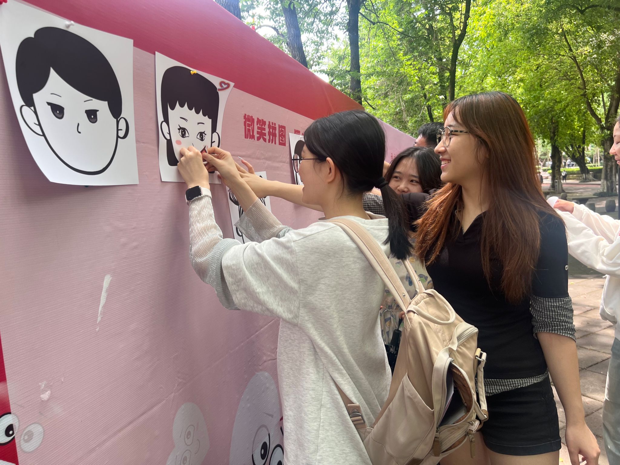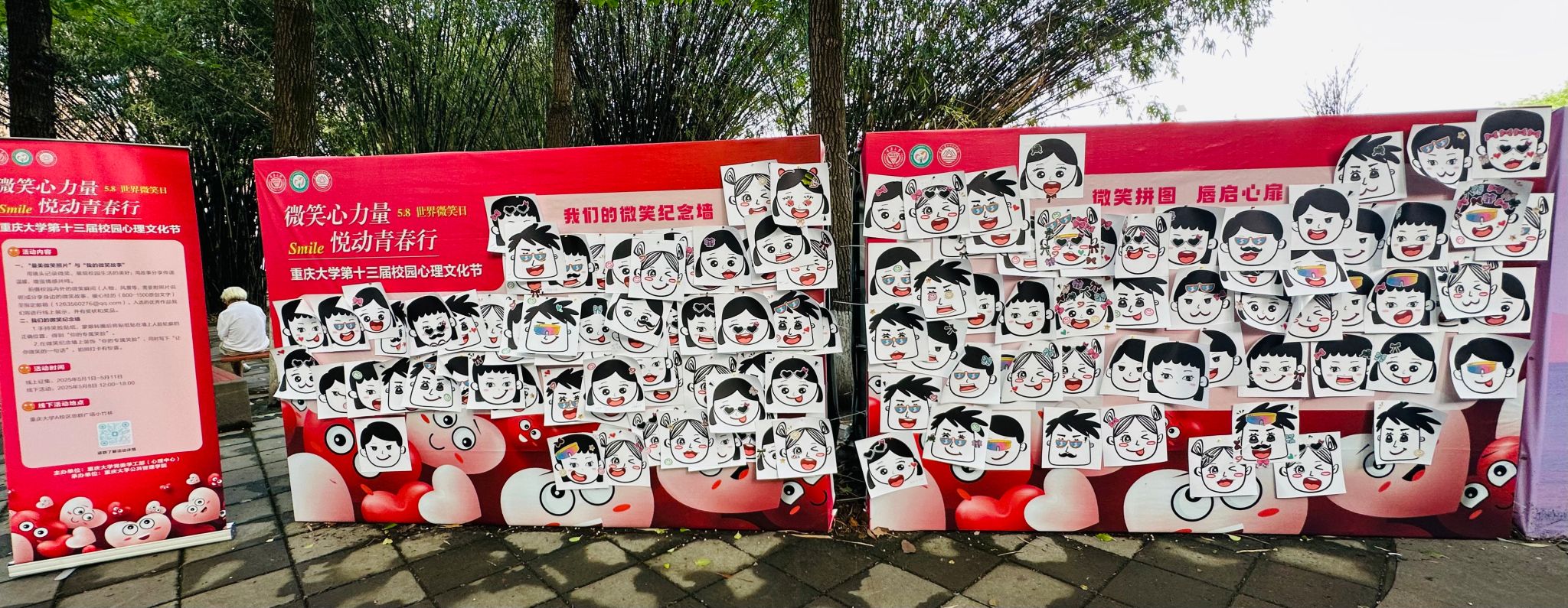 5月8日线下活动当天,A校区小竹林广场的“微笑纪念墙”成为校园焦点。活动现场设置了“微笑拼图 唇启心扉”互动游戏区和“我们的微笑纪念墙”打卡区。