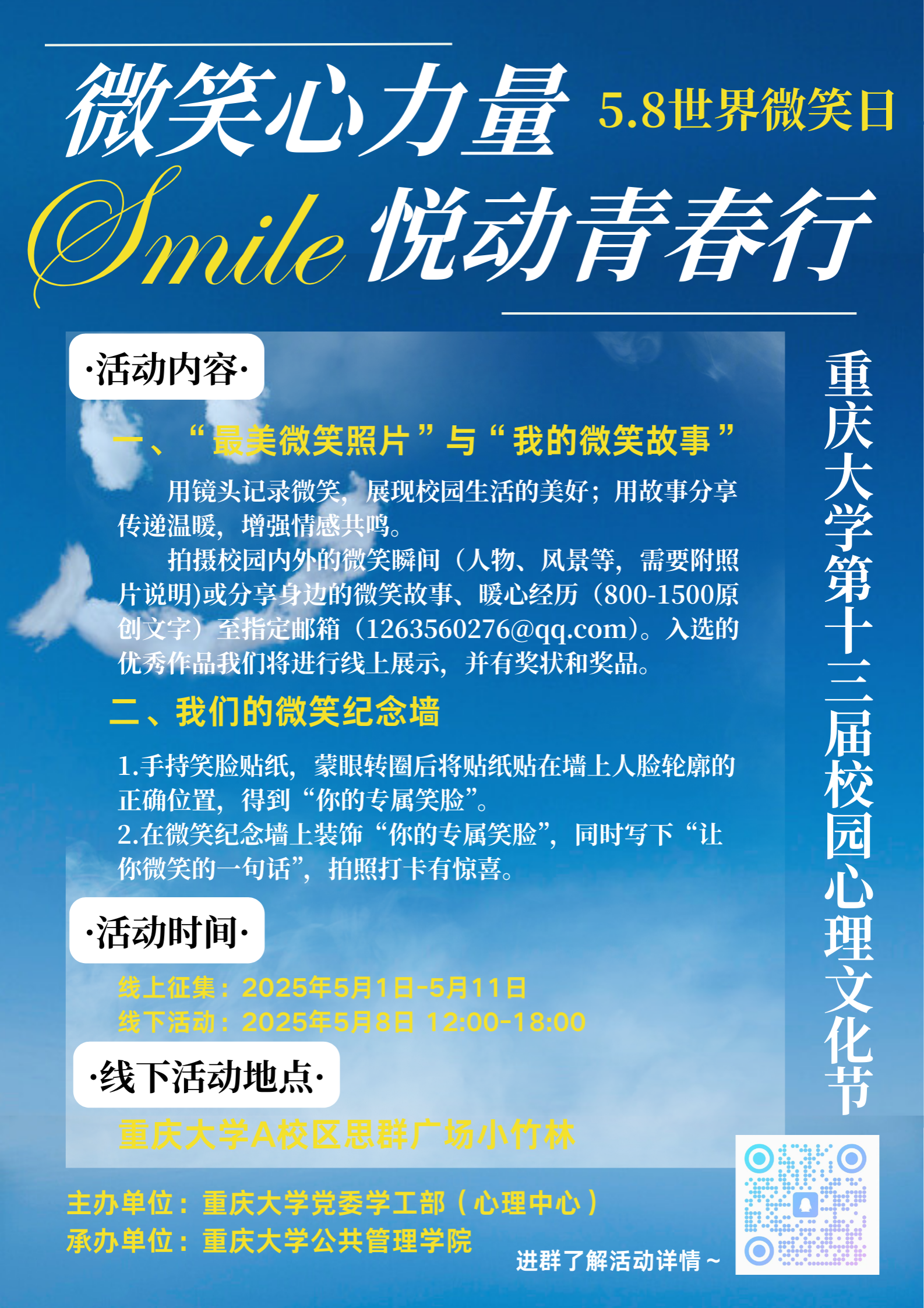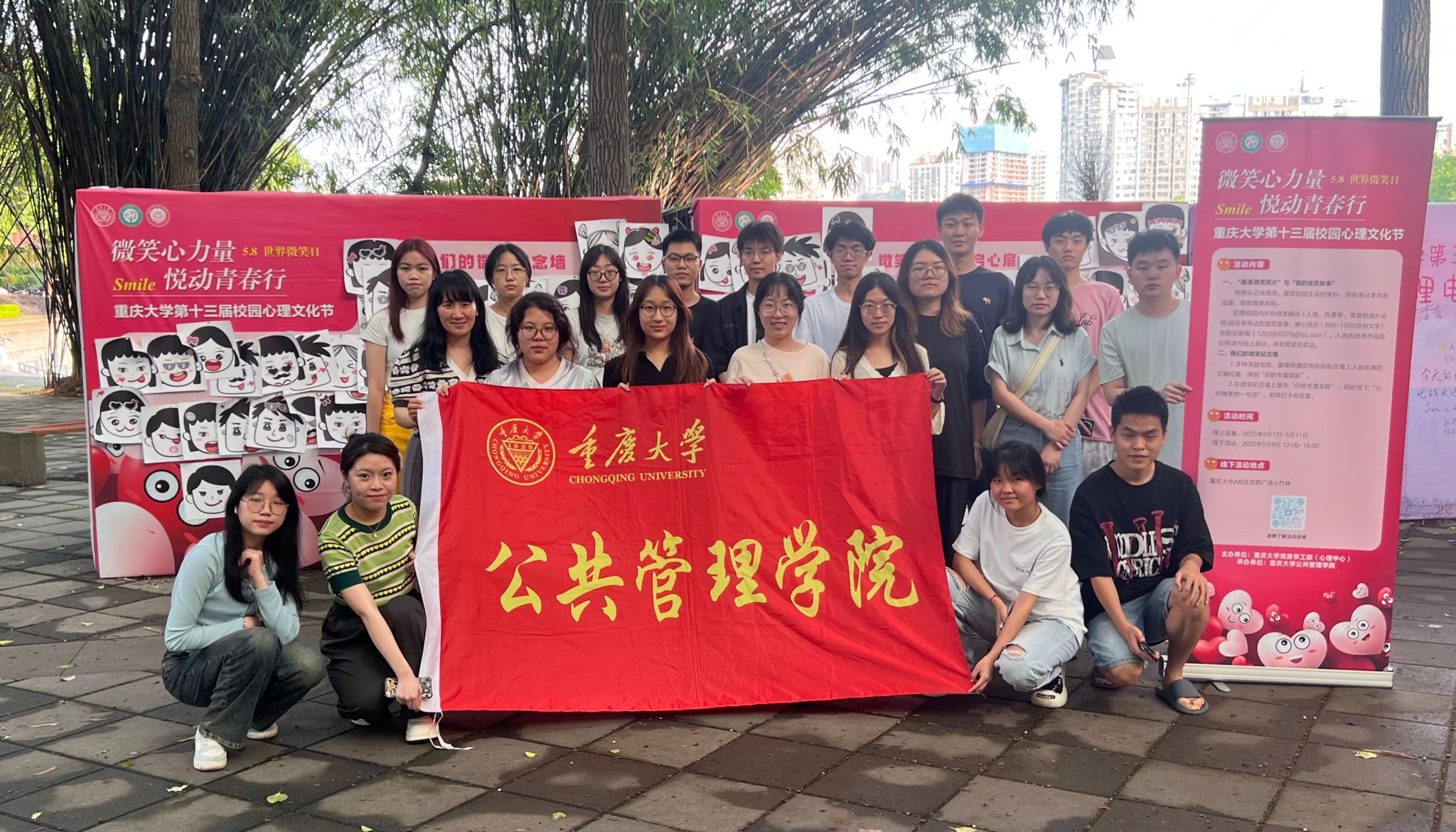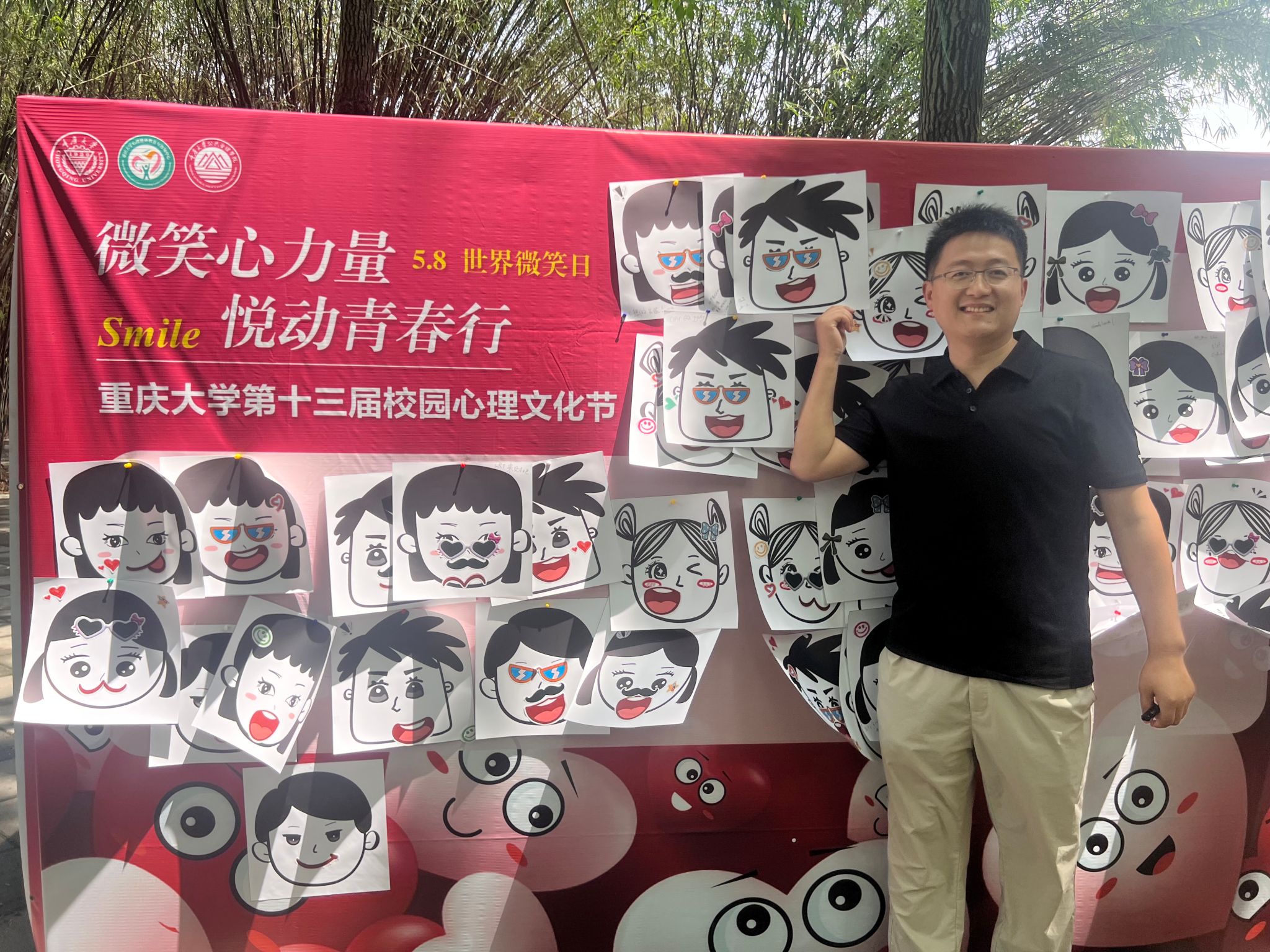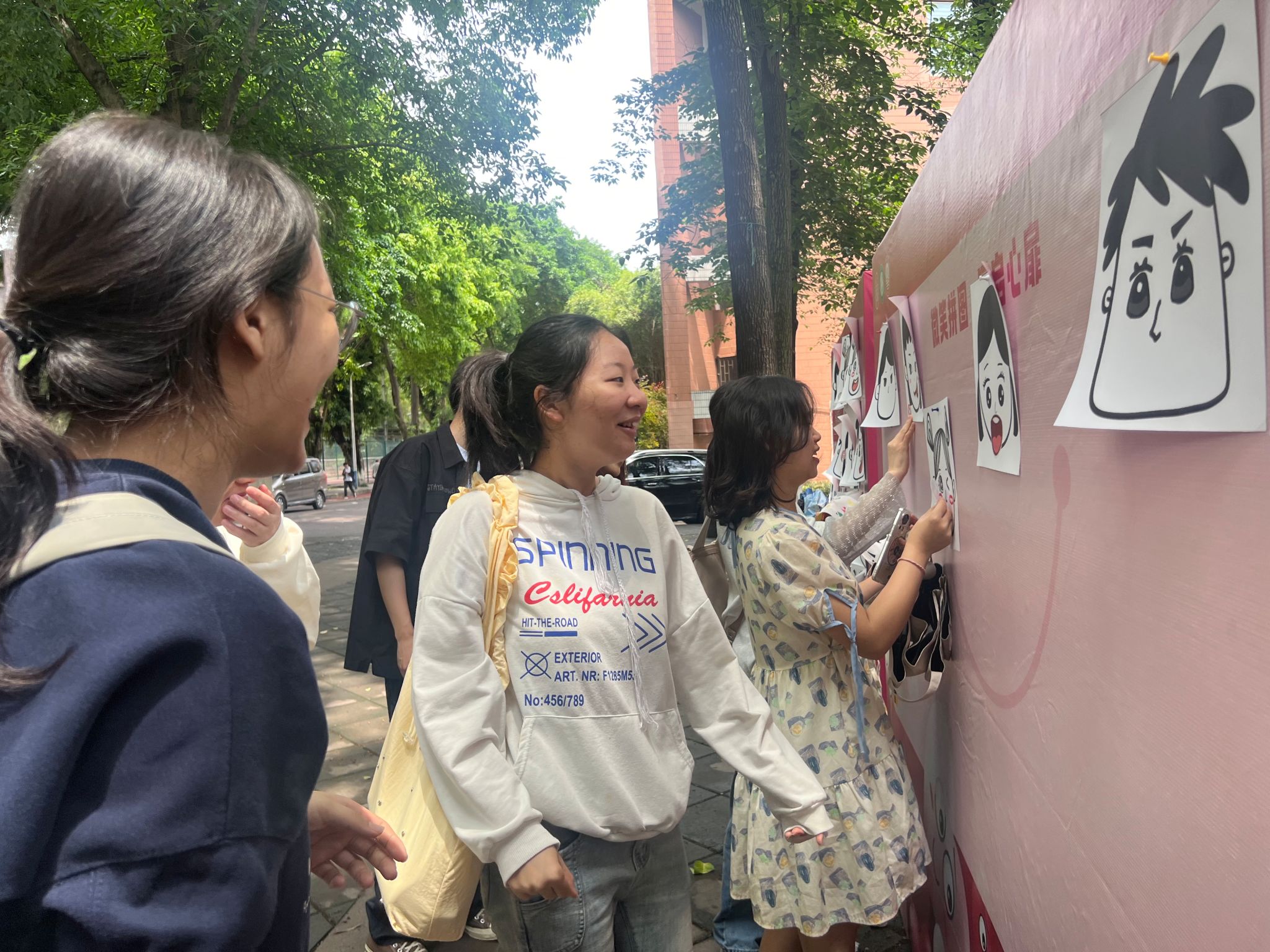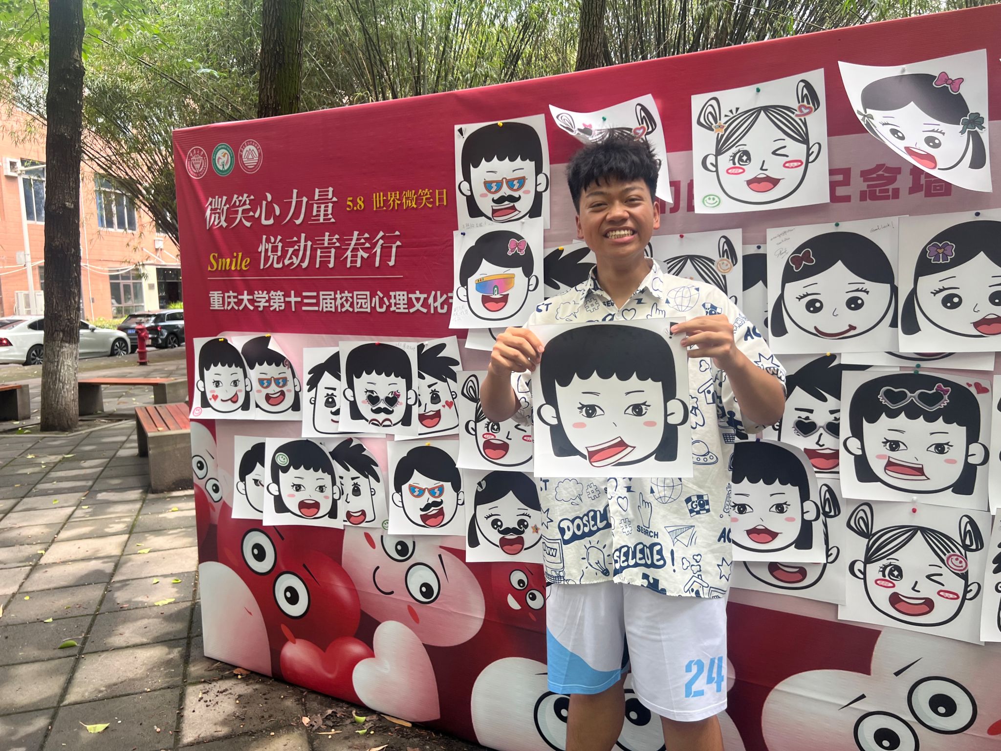 5月8日线下活动当天,A校区小竹林广场的“微笑纪念墙”成为校园焦点。活动现场设置了“微笑拼图 唇启心扉”互动游戏区和“我们的微笑纪念墙”打卡区。