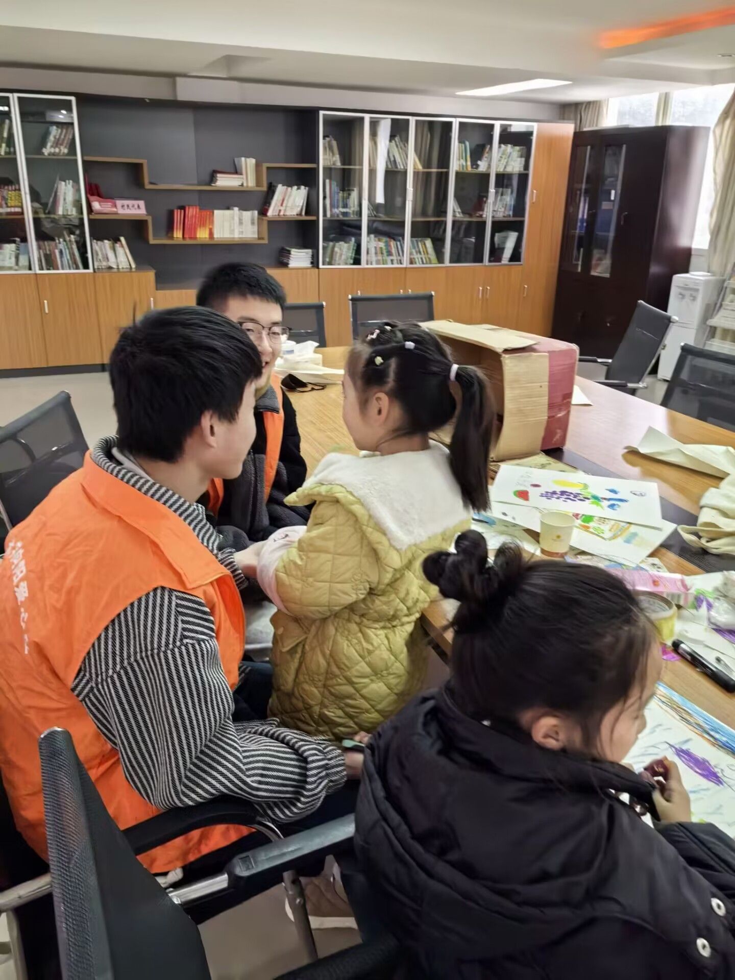 本次活动现场,志愿者们耐心十足,与小朋友们积极互动。志愿者与小朋友们围坐一处,气氛欢快而融洽。他们先是一同拿起画笔,志愿者温柔启发,帮助小朋友们将脑海中的奇妙想象化为纸上绚烂色彩。随后,又铺开棋盘,志愿者巧妙布局,引得小朋友们时而皱眉思索,时而眼睛发亮落子,满室皆闻欢声笑语,温馨愉悦之感弥漫开来。