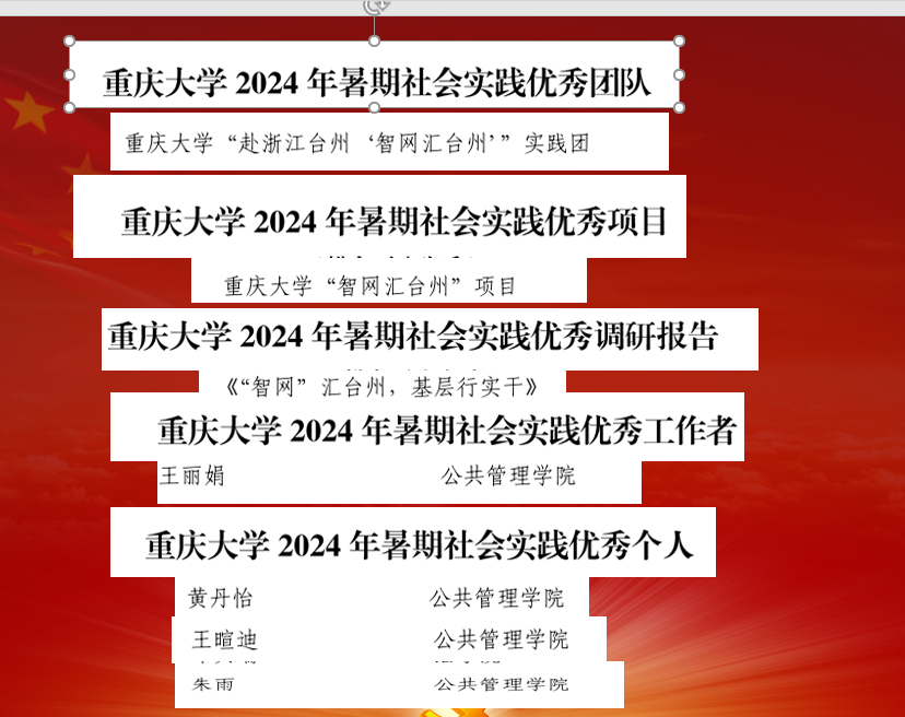 2024年暑期社会实践优秀项目奖项。团队在实践中深入台州,聚焦民营经济发展、大陈岛垦荒精神学习、社区网格化治理、乡村山区支教扶贫等领域,开展了一系列扎实有效的活动,形成了一系列出色成果。