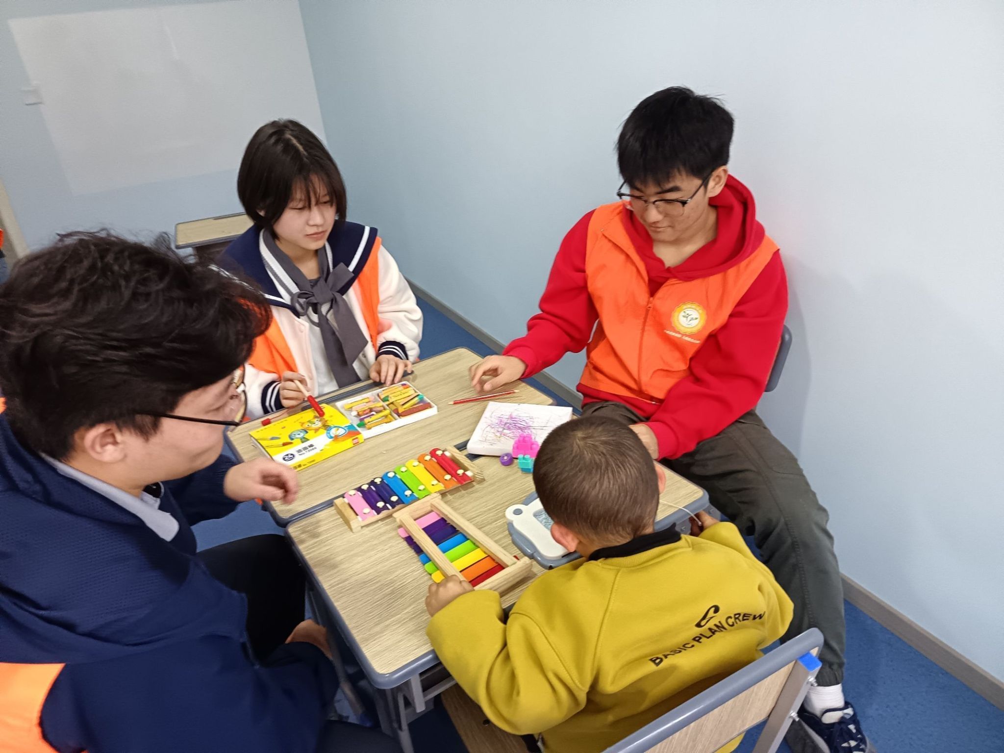 参与活动的志愿者们都本着认真负责的态度,与小朋友们度过了一个美好难忘的下午。活动过程中,由两到三名志愿者对接一位小朋友,保证每一位小朋友都有大哥哥大姐姐的陪伴,保障活动过程中的安全。活动过程中志愿者陪同启智中心的小朋友玩游戏和简单互动,例如画画、搭积木、玩小皮球、拼图、滑滑梯等。同时志愿者也会与随行的家长交流,了解孩子的情况。有一些小朋友安静地在教室里画了一下午画;有一些小朋友在搭积木方面很有天赋;有一些小朋友与志愿者共同敲出动听的音符......小朋友在短时间内与志愿者们打成一片,这也是对志愿者们的肯定。