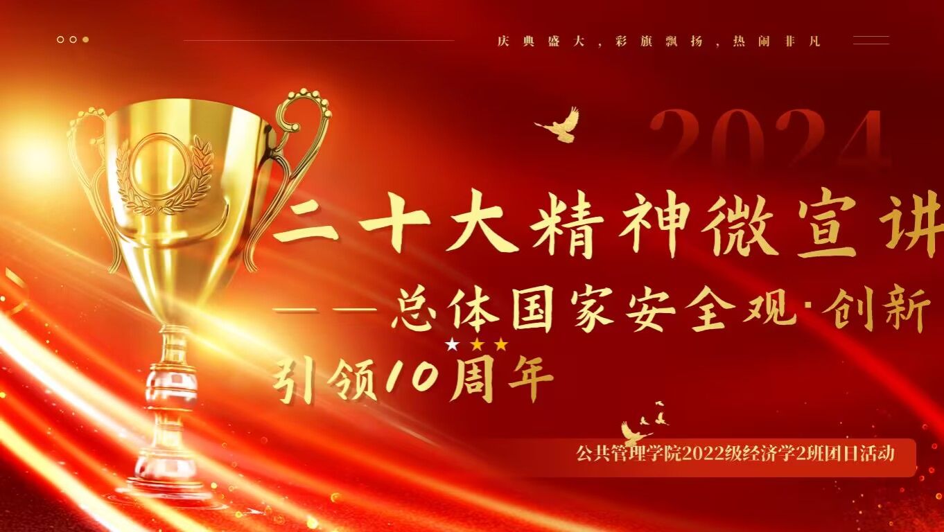 2022级经济学2班团支部在第五教学楼开展“二十大精神微宣讲—总体国家安全观·创新引领10周年”主题团日活动。本次活动共分为讲解二十大内涵和介绍总体国家安全观两个部分。