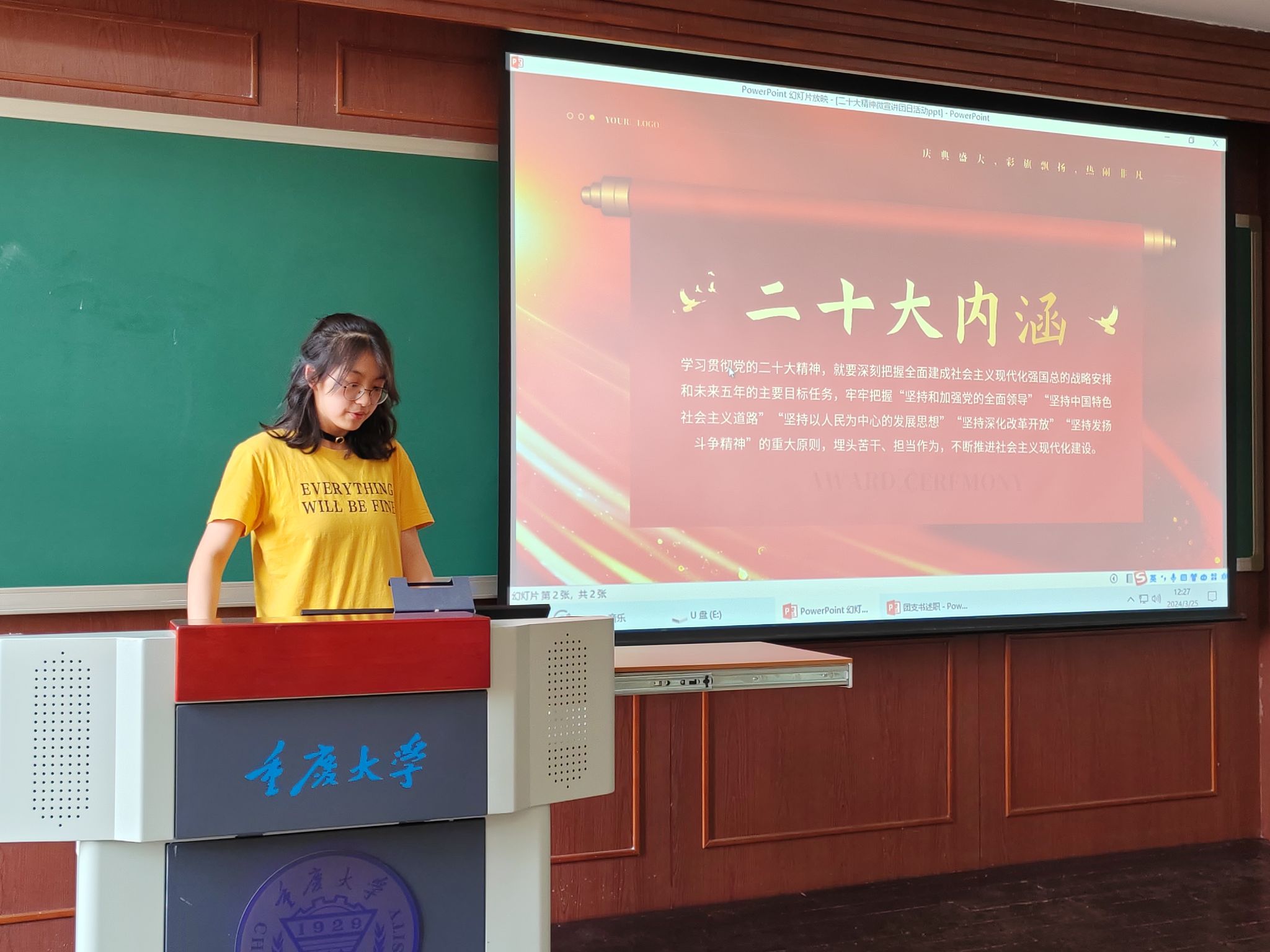 随后,活动进入了第一部分——讲解二十大内涵。团支书徐琪琦为同学们带来了生动而深刻的宣讲。她从二十大的主题、主要成果、战略部署等方面进行了全面系统的阐述,引导同学们深刻领会二十大精神的核心要义和实践要求。同学们认真聆听,不时点头思考,表现出极高的学习热情和求知欲。