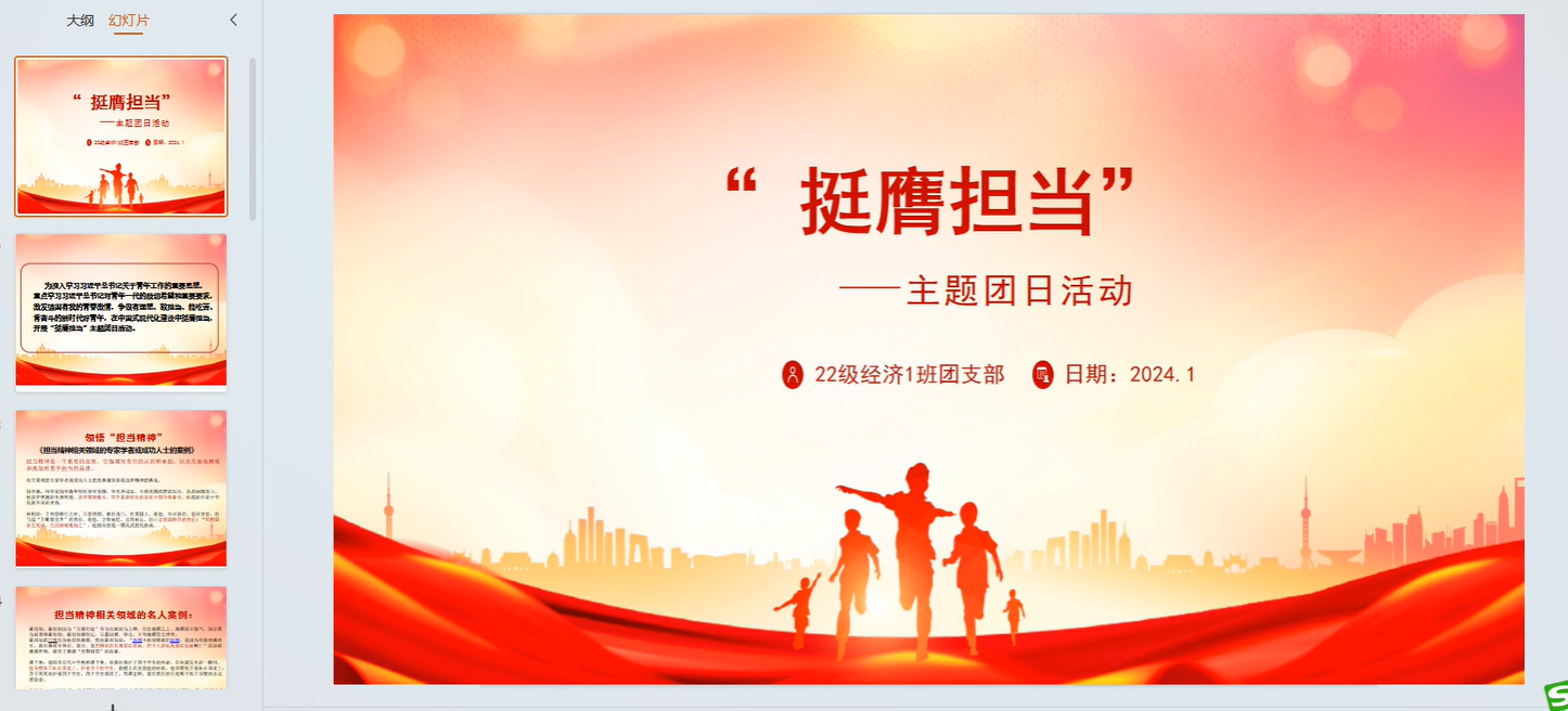 2024年1月14日上午,学院22级经济1班团支部在寒假开始的第二天,开展了“挺膺担当”主题团日活动。按校团委的要求,该团支部精心设计活动方式,用心安排互动环节,细心制作展示内容;团员们理论联系实际,认识结合实践,阅读材料并延伸思考,结合自身经历阐述感悟,达到了激发思想动力、培养责任担当的目的。该会议由团支部书记朱雨主持。