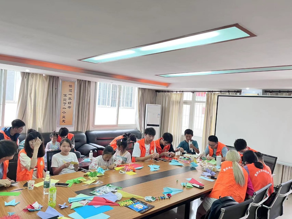 除了辅导孩子们薄弱科目和家庭作业外,志愿者们还积极地与孩子们开展兴趣活动,如剪纸、绘画、折纸等。孩子们拿到材料后便兴奋地向志愿者展示自己在学校里学到的一些新的折纸,选择绘画的孩子一边挑着颜色一边跟志愿者交流自己的选择理由和绘画灵感。这个过程锻炼了他们动手能力、语言表达能力、审美能力等,也体会到了通过自己努力取得收获的成就感。