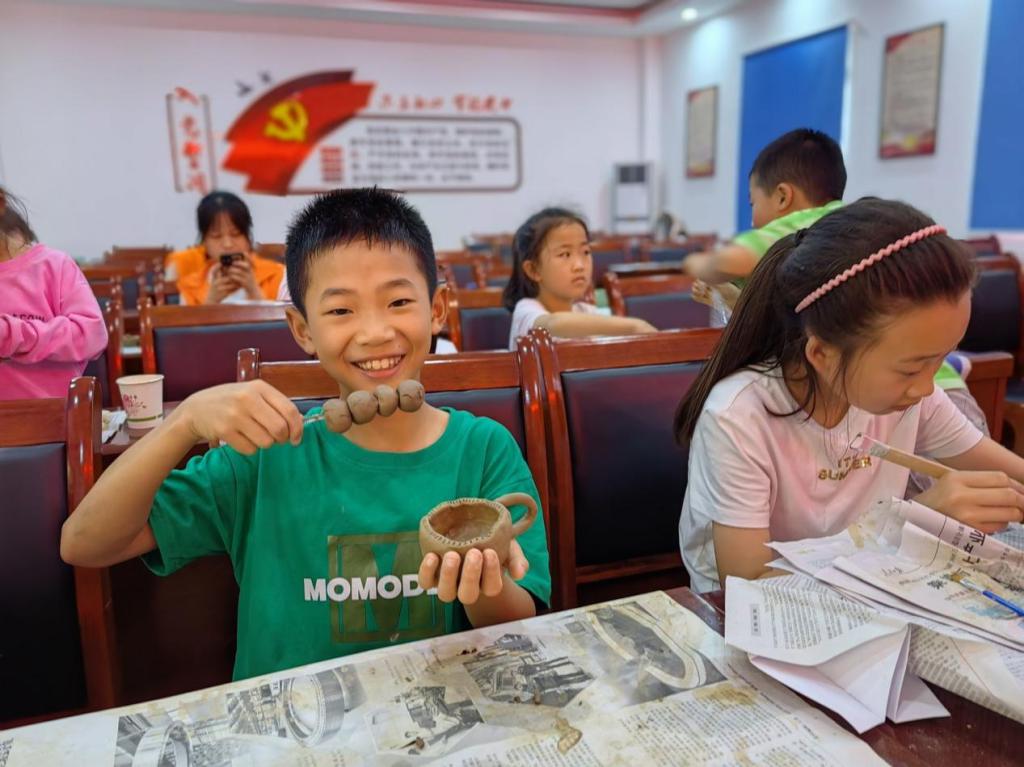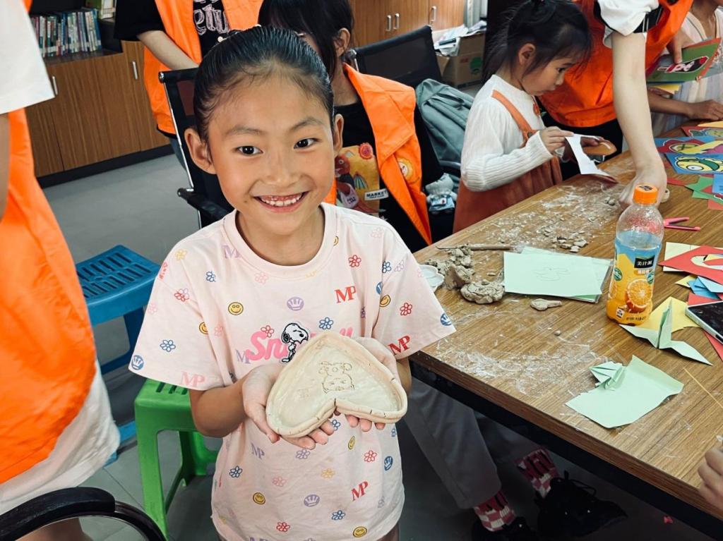 活动的后半部分更加精彩有趣,由志愿者们教孩子们学习陶艺。首先,陶艺社参与本次活动的社员们对小朋友进行了揉泥的教学,他们详细讲解并演示了如何正确使用手掌搓压陶泥。然后由志愿者辅助小朋友进行揉泥,他们将泥揉到一个合适的硬度并塑形成正方体。接着,大家教小朋友们如何将正方体泥块一点一点搓压开,塑造成自己想要的样子。教学结束后,小朋友们开始自由设计自己的作品,有做杯子的,有做碗的,还有的小朋友在作品上面雕刻或者粘上一些装饰,做出了小猪、小猫等等花样。整个活动充分激发了小朋友们的想象力,锻炼了他们的动手能力。最后,志愿者们还指导小朋友们完善自己的作品,平整作品表面,用水一点一点抹平裂缝。小朋友们对自己的作品都非常地认真仔细,专注地完善每一处细节。看着小朋友们完善作品时专注的眼神,和完成作品后微扬的嘴角,今天他们的收获不只是一个小小的陶艺作品,更是亲自动手实践想象的机会与以自己的劳动收获成果的成就感。