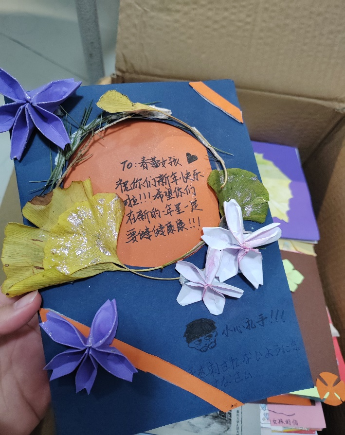 12月9日,所有贺卡收集完毕,计划送出,活动正式结束。通过这次活动,志愿者们不仅感受到了动手制作贺卡的乐趣,还了解到了在社会的另一些地方仍然有一些弱势群体,他们也是祖国的花朵,也有着对未来美好的愿望。只是他们目前遇到了一些逆境,只要受到社会的一些关爱和帮助,他们就能够越来越好。这也是向阳爱心社举办这次活动的意义所在,我们希望通过自己力所能及的方式,给世界上照不到阳光的地方送去一些光芒。我们希望能够将这个活动一直举办下去,将爱一直传递下去。