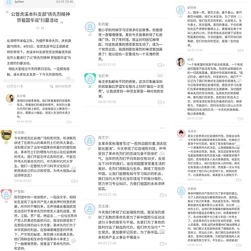 本次烈士陵园扫墓活动的开展更有力的培养党员们的爱国主义的情怀,深化对党的认识和理解,让党员们体会到革命先烈们留下的红岩精神和我们来之不易的幸福生活是如此的弥足珍贵。一件件文物触目惊心,记录下了岁月的痕迹,这是历史不堪的烙印。烈士碑上,每一个名字都是一个年轻热血的革命战士;历史墙上,每一段往事都是革命者对新中国的向往与热忱。扫墓结束后,支部成员们开设了讨论区,抒发对先烈们的缅怀之情,并表示要珍惜今天的幸福生活,为祖国的发展发奋读书。