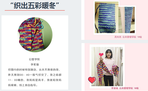 此外,在学院的大力支持下,公管学院五彩石服务队志愿者们还积极参加了由五彩石志愿者协会组织的“爱要大声说出来”视频征集活动、五彩石志愿者分享会、“织出五彩暖冬”、“以爱之名,以礼送暖”、留影五彩作文等一系列活动,涌现出一大批热爱志愿服务、乐于奉献的榜样志愿者。他们不仅为远方的留守儿童带去了温暖,还给志愿者们带去了有意义的心灵体验,通过自己的努力帮助他人,彰显了新一代公管人的热情与志愿服务精神。