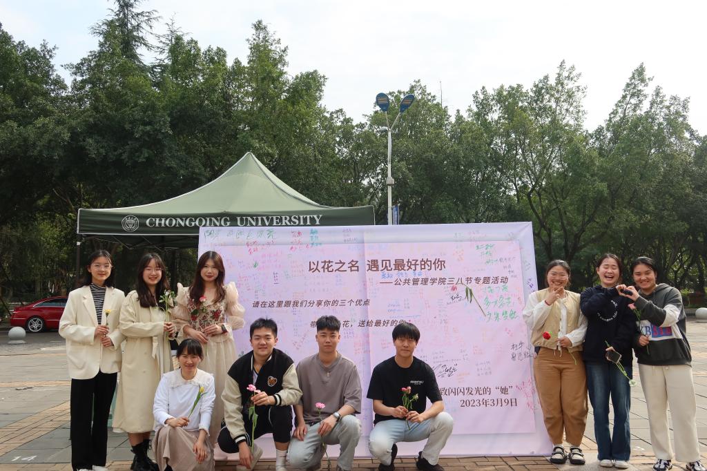 于2023年3月9日在虎溪校区一食堂南广场举办了“以花之名,遇见最美的你”三八国际妇女节专题活动。院团委书记兼2021级辅导员徐柳老师来到现场,本科2021级全体女同学都积极参加了活动。