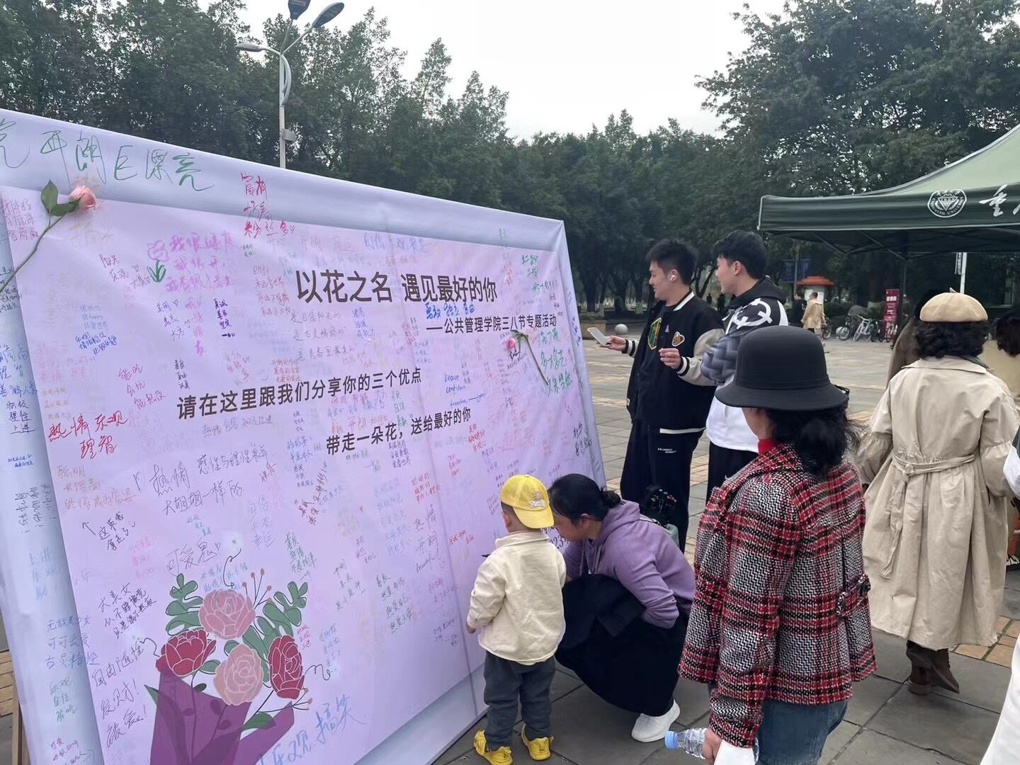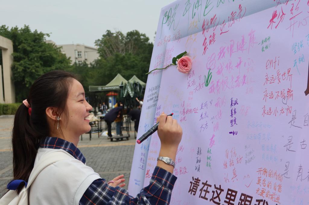 此次活动由学院本科生团委学生会主办,现场准备了两百余支鲜花,邀请前来参加活动的女老师和女同学们用彩笔在展板上跟大家分享自己的三个优点,就能带走一支鲜花。