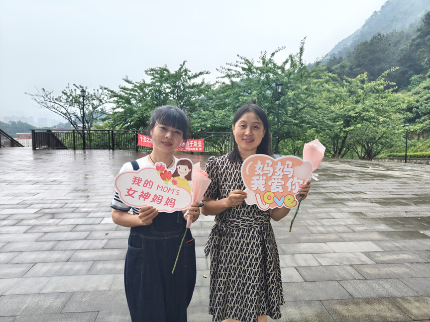 二组负责垃圾置换和母亲节Kt板拍照打卡活动。9名志愿者在山底布置置换和打卡活动现场,通过白色垃圾置换套圈等游戏方式,号召游客关注景区卫生环境;kt板“母亲节”打卡区吸引了众多家庭的目光,志愿者们鼓励参与者与Kt板合影,分享他们的母亲节故事以及对母亲的感谢留言,并转发照片到朋友圈。这些故事里的记忆和贴心的话语成为了母亲节最温馨的礼物,也让在场的母亲们感受到了家人的爱与尊重。活动结束后,学生志愿者积极交流,总结活动经验。