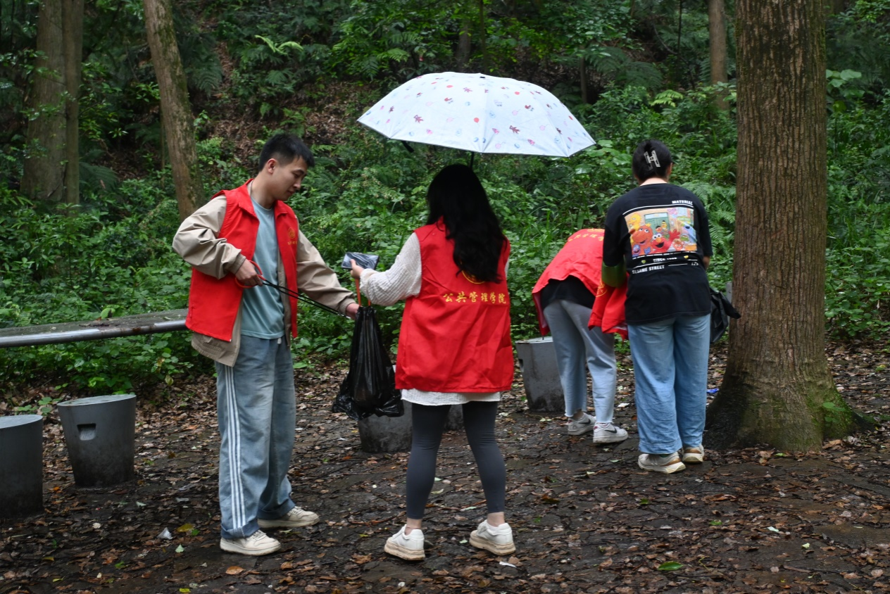 活动当天共19名志愿者分成两组,一组负责垃圾清洁和环保理念宣传任务。10名志愿者从山底出发清理路上的白色垃圾。活动过程中,志愿者们收获了游客们的不断称赞,且有不少游客自发拍摄视频为净山环保做宣传。