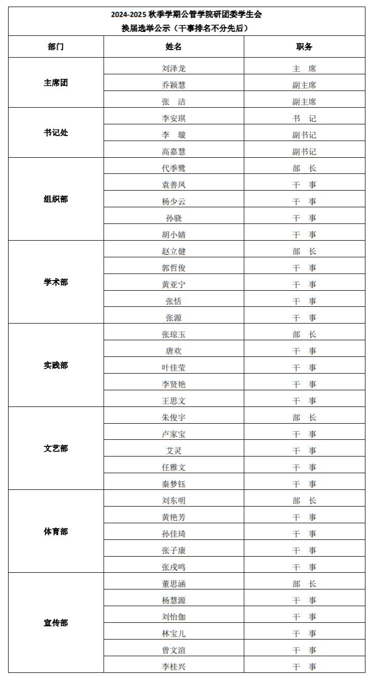 随着热烈的掌声,本次换届大会圆满地落下了帷幕。经过一系列紧张而有序的竞选流程,最终得出了竞选结果,现将竞选结果正式公示。