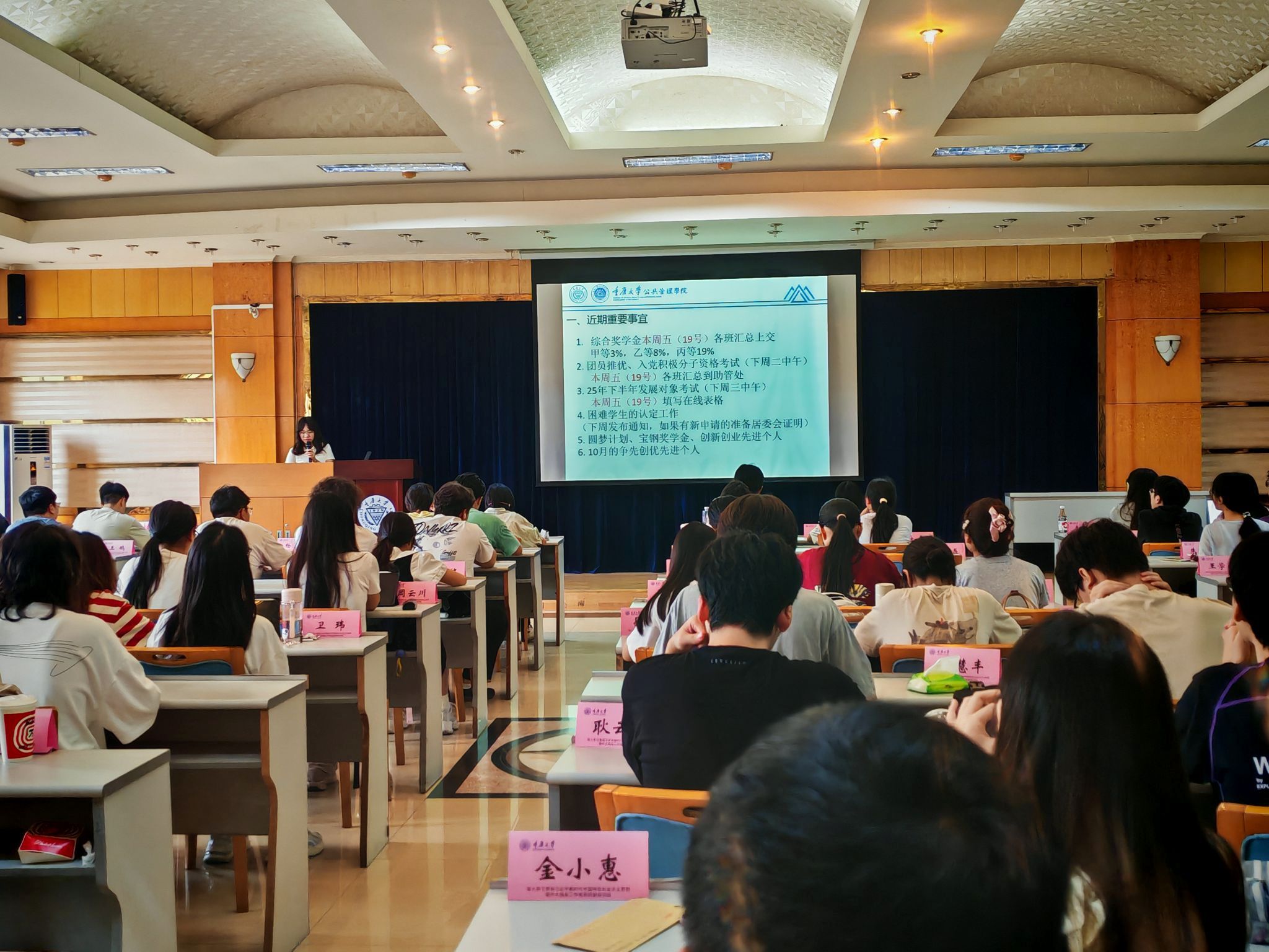 大会伊始,李庆老师围绕本学期学生关注的核心事务,系统梳理了团员推优、入党发展对象确定、综合奖学金评定及争先创优评选等工作。李老师详细解读了各项工作的标准要求,更着重强调了材料提交截止日期等,确保每位学生清晰知晓流程、准确落实任务,避免因信息偏差影响个人权益。