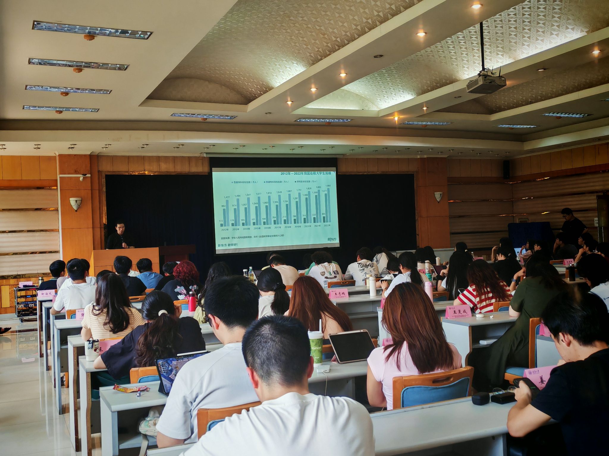 最后,新东方考研讲师围绕考研全流程展开讲解,结合近年考研政策变化与数据,梳理了报名时间节点、初试科目设置及不同专业的备考侧重点。