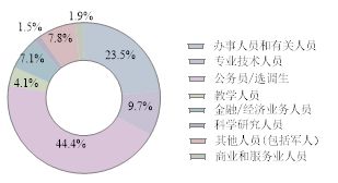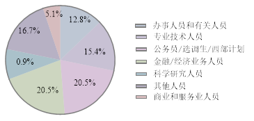 硕士毕业生就业职业较本科生更为集中,近一半为选调生或公务员共119人,占就业总数的44%;办事人员及相关人员共63人,占比24%,广泛分布于公共管理社会保障组织、交通运输业、电气水供应业等等;专业技术人员为26人,占比10%,主要分布在建筑业、制造业、卫生和社会工作、信息传输等;金融/经济业务人员19人,占比7%,基本都在金融业;担任教学人员共有11人,其中7人在高等教育单位,3人在中初教育单位,有在科研设计单位的科学研究人员4人;有商业和服务业人员5人,分布在房地产业、交通运输业、租赁商务业和信息传输业;另有其他人员21人,除了3人为军人外,其余大多分布在制造业。