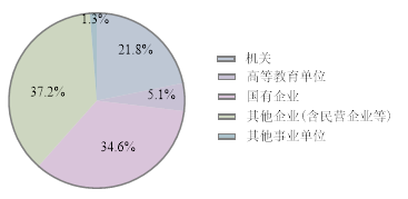 硕士生近一半在政府机关单位,共122人,占比45%;进入其他事业单位的共19人,占比7%,基本都在公共管理、社会保障和社会组织中;其次为国有企业共55人,占比20%,主要是制造业、金融业、制造业和电力、热力、燃气及水生产和供应业;在其他企业(含民营企业)中共42人,占比16%,主要是房地产业、金融业和制造业;硕士生进入高等/中初教育单位18人,占比7%;其余则为科研设计单位(3人)、部队(3人)、外资(3人)、医疗卫生单位(4人)。