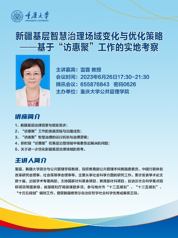 2023626日,新疆大学政治与 电影天堂 教授、教育部公共管理本科教指委委员雷霆教授,应邀为电影天堂 师生开展《新疆基层智慧治场域变化与优化策略——基于访惠聚工作的实地考察》主题在线讲座。电影天堂 MPA导师及学生共计200余人参加,副院长张鹏教授主持讲座,MPA教育中心主任谭志雄教授进行总结。