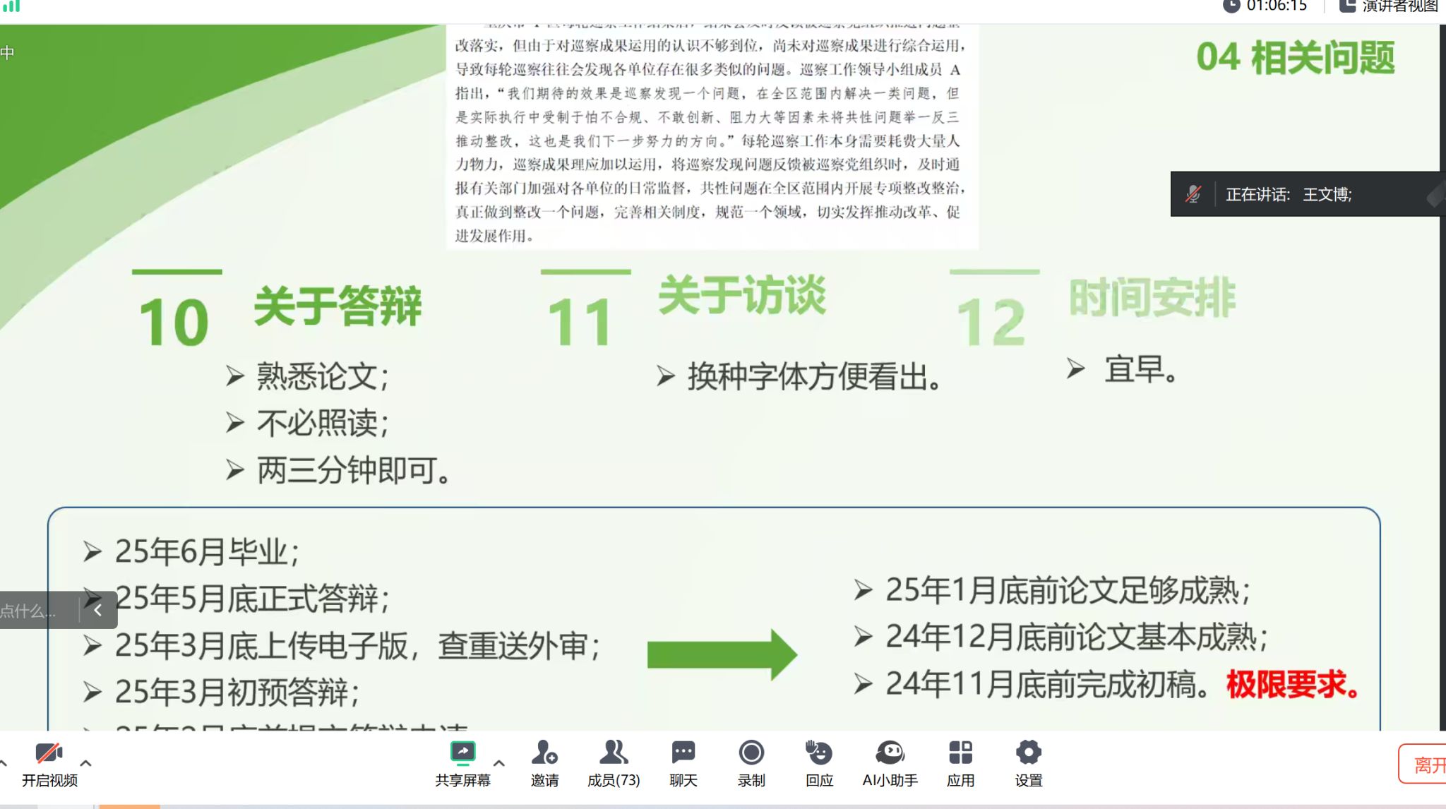 紧接着,王文博就论文的撰写,从选题背景、撰写过程、论文框架、相关问题和心得分享方面倾囊相授。