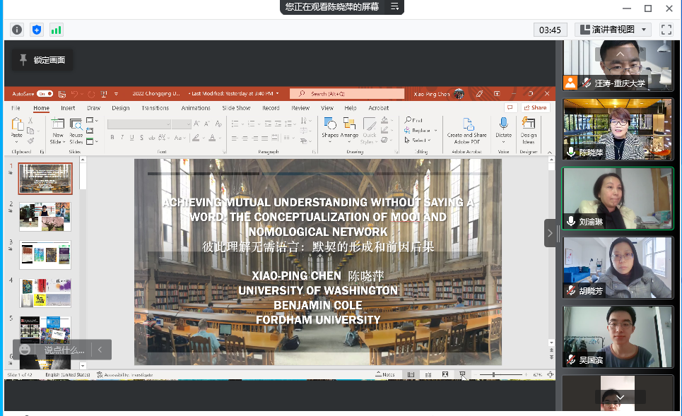 2022-04-26为了进一步开阔师生的视野,发掘学术兴趣,启发科研思路,2022年3月4日上午10点, 电影天堂 举办了以《彼此理解勿需语言:默契形成的前因后果》为主题、以腾讯会议为依托的线上讲座。本次讲座的主讲人是美国伊利诺大学工业和组织心理学博士、美国管理学会院士、美国心理学会院士陈晓萍教授。讲座由 电影天堂 副院长刘渝琳教授主持。陈晓萍潜心于教学研究,曾任美国华盛顿大学福斯特商学院副院长和组织管理学主任,...
