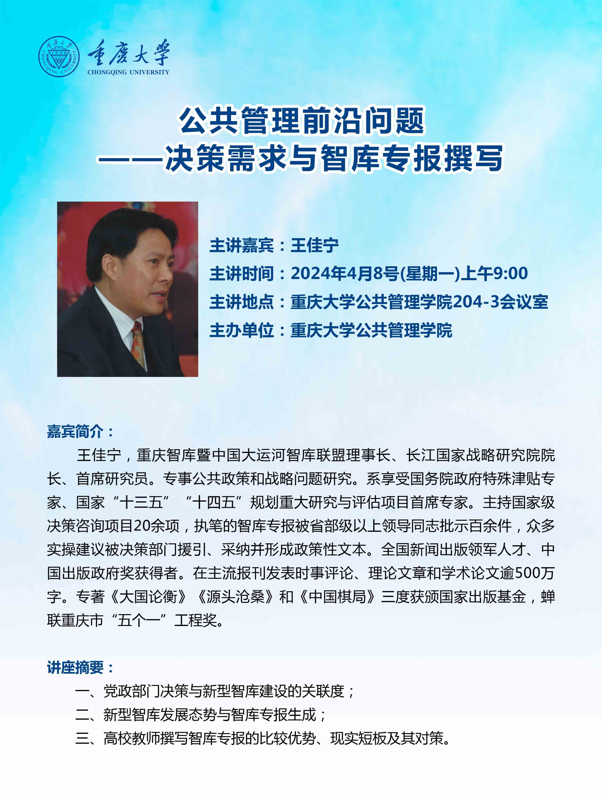 2024-04-232024年4月8日上午9点,重庆智库暨中国大运河智库联盟理事长、长江国家战略研究院院长、首席研究员王佳宁受邀于 电影天堂 进行关于决策需求与智库专报撰写的学术讲座,同电影天堂 教师、学生就智库专报等相关公共前沿问题的理解与经验进行分享。 电影天堂 副院长王辉副教授、学院教师以及相关专业研究生参加座谈,学术讲座由王辉主持。王佳宁从农村三变革实例出发,深入浅出的讲解了智库专报如何服务于中央与地方的决策需求,智库...