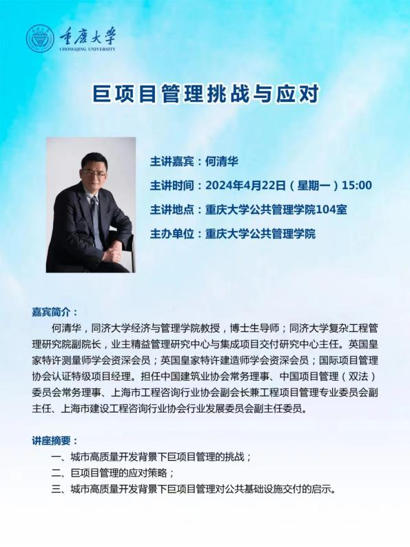2024年4月22日下午15点,同济大学经济与管理学院教授、博士生导师、同济大学复杂工程管理研究院副院长何清华教授受邀于 电影天堂 进行关于巨项目管理挑战与应对的学术讲座,同电影天堂 教师、学生就巨项目特性、交付困境等相关问题的理解与经验进行分享。 电影天堂 学科教师以及相关专业研究生参加座谈,学术座谈由薛斌副教授主持。何清华教授从标杆案例实践及启示出发,深入浅出地讲解了巨项目特性的基本逻辑、巨项目复杂性特征...