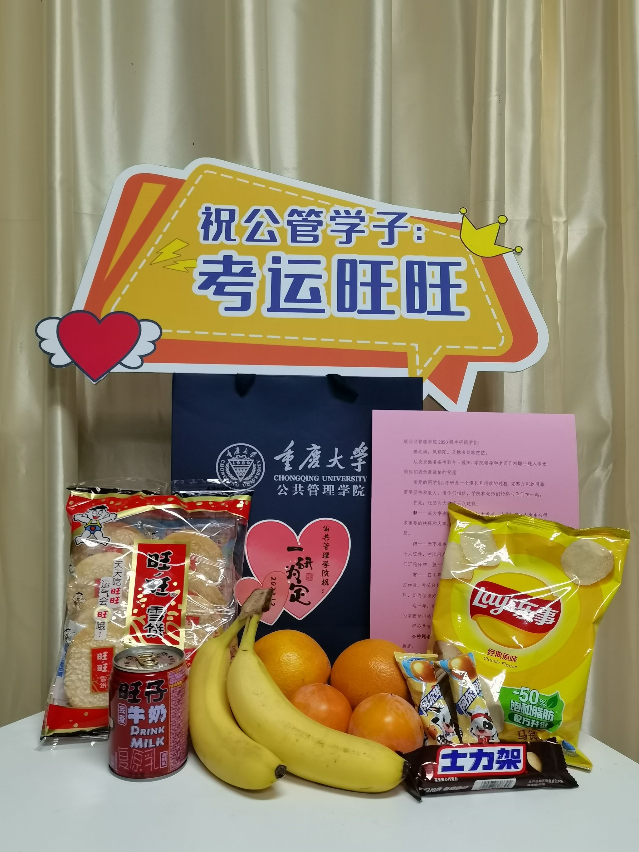2023-12-252024年全国硕士研究生招生考试近在咫尺,为鼓舞考研学生士气、坚定考研冲刺决心,2023年12月21日下午四点,学院党委书记张玲、党委副书记周余斌、学办主任2022级辅导员王丽娟、20级辅导员包晗对考研学生们进行了暖心慰问。学院高度重视考研学生关怀工作,提早一周就开始了慰问准备工作。学院悉心准备的慰问礼包外包装印有“一研为定”的定制祝福语,内包含橙子、柿子、棒棒糖、士力架等食品,有着“心想‘柿’‘橙’”“金‘棒...