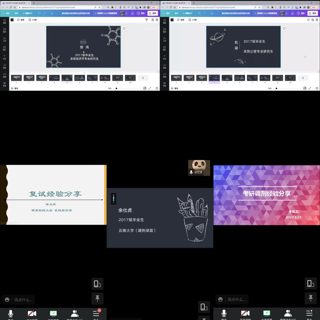 2022-04-07时维三月下旬,全国各院校考研初试分数线陆续公布,复试即将进行。为了帮助学院2022届本科考研学子们更好地准备研究生入学复试,学院邀请了五位2021届和2020届考研成功、有着丰富复试经验的学长学姐为同学们们进行考研复试经验分享,会议于2022年3月23日晚19:30以线上会议方式举行,由 电影天堂 团委书记、2022届辅导员徐柳老师主持、42名考研学子参会。首先为大家进行分享的是目前在电影天堂 2020级产业经济学专业就读的郑鸿学...