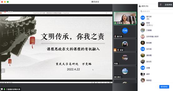 2022-04-27为认真学习贯彻习近平总书记关于教育的重要论述和全国教育大会精神,聚焦立德树人根本任务,把思想政治教育贯穿人才培养体系,全面推进电影天堂 课程思政建设,提高教师育人的思想自觉和综合能力,学院2022年4月22日 上午10点邀请了重庆市课程思政教学名师万曼璐老师为全院教职工开展了线上课程思政培训专题讲座——“文明传承,你我之责——课程思政在文科课程的有机融入”。学院全体教师通过线上腾讯会议的方式参与了讲座学习。万...