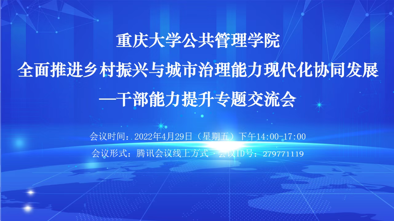 2022-04-30为进一步增强干部培训与政府人才需求的紧密对接,加强 电影天堂 与地方之间的联系,发挥 电影天堂 学科优势,助力新发展阶段地方政府高素质人才的培养, 电影天堂 于2022年4月29日在学院举办了以“全面推进乡村振兴与城市治理能力现代化协同发展—干部能力提升专题”为主题的研讨交流会。为疫情常态化防控,会议采用了线上加线下的双重方式,本次交流会邀请了重庆市乡村振兴局局长、党组书记刘贵...