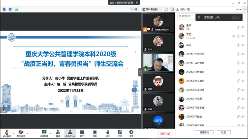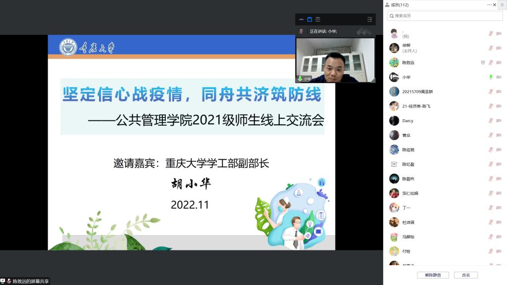 2022-11-26面对疫情的严峻考验,为了给同学们科学分析当前疫情形势,解读防疫政策,提高学生的防疫意识,增强同学们战胜疫情的信心,2022年11月12日晚19点 电影天堂 召开了“坚定信心战疫情,同舟共济筑防线”2021级师生主题交流会,特别邀请到电影天堂 学工部副部长胡小华老师与同学们进行线上沟通和交流。交流会由学院2021级辅导员、团委书记徐柳老师主持,全体2021级同学参会。胡部长从三个方面进行了分享。首先,胡部长科学分析了...